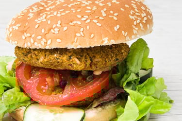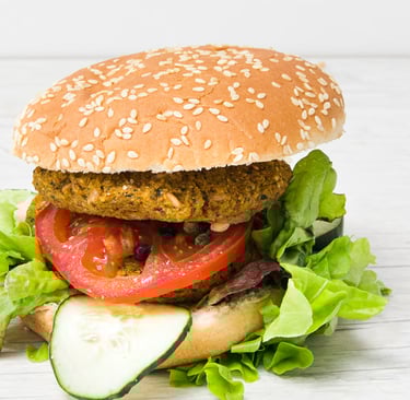 Hamburguesa con base de garbanzos, vegetales frescos y salsa de aguacate cremosa.